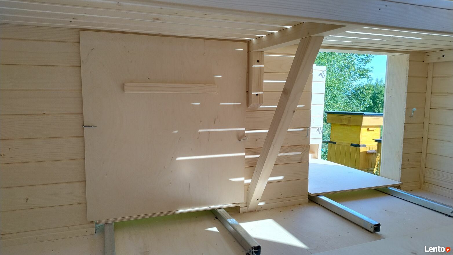 Miejsce na 4 ule wysuwane na szynach. Możliwość włożenia całego ula pod leżak dennica korpus półnadstawka oraz powałka z siatką lub zamiast półnadstawka korpus górski.