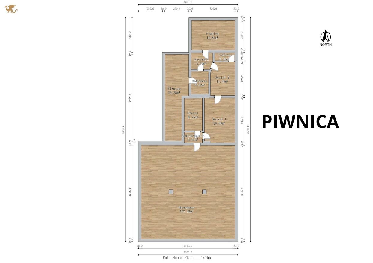 Piwnica: 228,7 m2 idealna na zaplecze techniczne, magazyn, archiwum, szatnie lub strefy pomocnicze