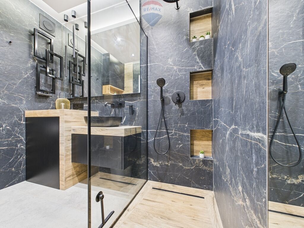 relaksu. Prysznic walk-in z deszczownicą, podtynkowa armatura oraz